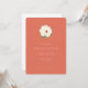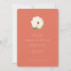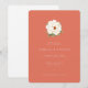 This elegant wedding invitation features a minimalist layout with a large, detailed illustration of a white peony flower centered at the top. The soft coral background (~#E67C73) creates a warm and inviting tone, complemented by clean, vertical text alignment in sophisticated serif fonts. The design emphasizes simplicity and clarity, making it perfect for couples seeking a classic yet modern aesthetic for their special day.
