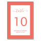 Elegant coral wedding table numbers. Easily personalise online. Matching items available to complement this modern coral wedding table number card.