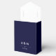 This elegant, stylish wedding favour box features modern white text on a dark, navy blue coloured background.
