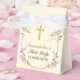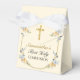 Celebrate your daughter's 1st Holy Communion Reception by giving your guests these Pretty Cream Floral Gold Cross First Holy Communion Favour Boxes. A soft buttercream yellow background complements a simple gold cross with a gold geometric frame and pretty blue, peach, and yellow flowers and tied by a white ribbon. Personalise with your daughter's name.