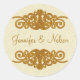 Elegant wedding envelope seal sticker done in a pretty cream and khaki swirl pattern. Graphics of gold tone decorations above and below the golden brown text. Personalise the text, with the bride and groom's names or anything you want it to read. Lovely finishing touch to wedding invitation envelopes and thank you cards.