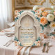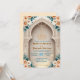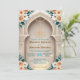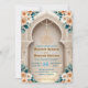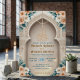 Set a sophisticated tone for your Nikkah ceremony or Walima reception with this elegant architectural design. The layout features soft peach roses and sage green leaves framing a printed faux gold Bismillah script against a cream background. Easy to customise with your specific venue details and dates.