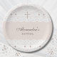 Personalize this Christian baptism paper plate for a truly memorable, faith-filled celebration. The design features a delicate cross in elegant soft beige pearl graphics with white lace and pearl graphic details, set against a soft pink beige background. A minimalist yet graceful style makes it perfect for a christening, simple baby dedication, or baptism with a touch of vintage charm. The mocha brown colored typography and flowing script font adds warmth and elegance to the design. These paper plates beautifully blend timeless details with a refined, classic look, making them an ideal choice for your sacred occasion. Be sure to see the collection for matching items to complete your coordinated look.