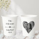 Celebrate your special day with these cute custom wedding paper cups. This design will turn your photo black and white. Simply personalise with your names, date, and photo. This design includes many different ways of personalisation, both in writing and in a photo. The front of this design includes a photo cut to the shape of a heart. The back of this design includes a place for your last name, first names, date of wedding, and an elegant heart divider, Enjoy!