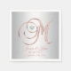Modern yet elegant wedding napkins for your reception. LETTER 'M', Not cheap looking but expensive and classy. Last name, bride and groom's names and date. Faux rose gold letter with faux diamond heart. Font and size can be edited. Background colour (silver grey) can be changed. Cocktail napkins also available. Found in 'Wedding NAPKINS & PLATES' wedding collection. Contact Designer for special designs (letters and colours)