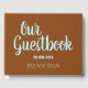 This generic guest book features the messages "Our Guestbook" and "PLEASE SIGN", along with a personalised date. The text is coloured turquoise, and the background is coloured brown. A generic, customisable guest book like this might be used at an event such as a baby shower, a wedding, a funeral, or some other event.