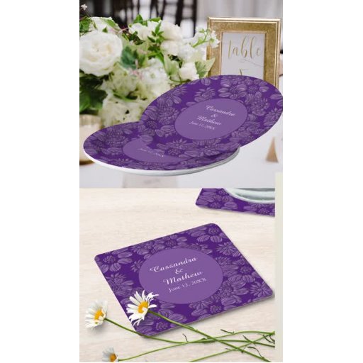 Purple Wedding products feature elegant daisies with a 3D-like appearance and a translucent background to showcase your preferred colour. The middle section displays a solid circle with the names of the couple and their wedding date on the front. The back has the design only. Customise the colour of the background when you Edit it.