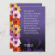 Add style to your wedding reception with this floral-themed table seating chart, which lets guests find their table. Features elegant white lettering, garlands of colourful African daisies, and lavender purple confetti set on a violet purple to black background. Customise with names of the attendees and table number.