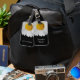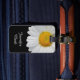 Elegant luggage tag done in black, with a close up photo of a white and yellow daisy bloom, on one end of the tag. White text, on the bottom end of the tag, is ready to personalise. Lovely way to spot your luggage from a distance.