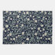 This seamless floral pattern features delicate white daisies with soft yellow centres, surrounded by pale green leaves and tiny buds, all set against a deep navy blue background. The design exudes a classic, timeless elegance perfect for wallpapers, textiles, and stationery. The contrast between the vibrant flowers and the dark backdrop creates a sophisticated and calming aesthetic.