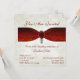 Lovely off white damask birthday party invitations, with graphics of a red damask ribbon, across the middle. A large oval ruby and two small round diamonds decorate the ribbon. Red text is fully customisable to suit your party needs. Very lovely invitation. Matching envelopes available.
