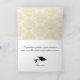 Stylish graduation greeting card, done in a pale golden yellow and off white damask pattern, with graphics of a black graduate's mortarboard cap, with a gold tone tassel, in the upper right corner. Gold tone graphic script text reads Congratulations, on the front. Black text greeting, on the inside, is ready to personalise to read what you want. Pretty card to your favourite graduating girl.