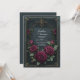 Transport your guests to a realm of dark enchantment with this stunningly dramatic invitation. The design centers around a magnificent gothic archway, formed by intricate, dark-on-dark filigree that resembles an antique cathedral window or a vintage mirror frame. Anchoring this architectural beauty is a lush arrangement of deep burgundy roses at the bottom, their velvety petals rendered in rich wine and crimson tones, while smaller buds and thorny vines climb elegantly up the sides. The background is a textured charcoal slate, providing a moody and mysterious canvas that allows the deep red florals to pop with intense passion. This mysterious design is an impeccable choice for a twilight gothic wedding, a vampire-themed masquerade ball, or a dramatic Halloween engagement party. You might also choose this aesthetic for a "death to my 20s" birthday celebration, an upscale murder mystery dinner, or a theatrical premiere announcement. This decorative arched border is also perfectly suitable for luxury tattoo studio gift certificates, antique bookshop business cards, or occult boutique event flyers.