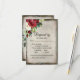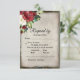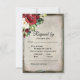Exquisite dark red and white watercolor floral arrangement at the top left corner of response card. Grey grunge background with elegant script and serif font combination for rsvp details. Back of card features an enlarged version of the same elegant floral arrangement on the same textured grey grunge background.