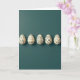 This design shows five cream-colored egg shapes arranged in a neat row across a deep, muted teal background, viewed from above like a quiet tabletop scene. Soft, diffused light gives each egg a gentle lift from the surface, with long, faint shadows stretching to one side. Each egg is decorated with thin black line art, mixing angular geometric slices, flowing wave lines, tight swirls, and small icon-like marks that resemble stars and diamonds. The repeating cream-and-black pairing ties them together, like close friends dressed for the same occasion while still showing their own style. A small greeting in black sits near the top center, with a second line in a lighter cream placed below it, leaving plenty of open space around the artwork 🌷. The overall layout feels calm and affectionate, as if the eggs are leaning into one another through their matching patterns 🐇. The far-right egg shows a cluster of tiny star shapes near its upper curve, with a slim shadow tapering beneath it.