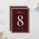 Add a polished finishing touch to your reception with this burgundy and ivory wedding table number featuring elegant typography and a rich, classic color palette. The deep burgundy background paired with soft ivory lettering creates a look that feels timeless, refined, and sophisticated, perfect for formal weddings, black tie celebrations, and fall or winter events. Designed to complement classic and elegant wedding styles, this table number brings understated luxury and visual cohesion to your reception tables.