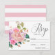 Formal with a bit of whimsical style wedding invitations RSVP with delicate bouquet of pink flowers and leaves and white and pink striped pattern on the reverse of the card.