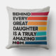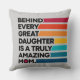 Elegant Mothers day Throw Pillows featuring a cute saying that reads "Behind Every Great Daughter Is A Truly Amazing Mum."
