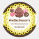 © 2021 Socialite Designs. Elegant dessert bakery sticker design incorporating a chocolate brown damask pattern background, yellow scalloped border banner for your text, and cake pops, cupcake, cookies and chocolates design.