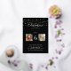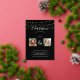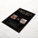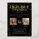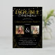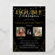 Elegant graduation party gold foil invitation for a double celebration, featuring a trendy black background that can be changed to any colour, string fairy lights, real foil gold glitter with gold fonts and picture frames, a photo of each graduate and a modern template, which can easily be customised.