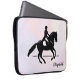 Laptop sleeve with a black and white illustration of a dressage rider. The horse and rider are performing a pirouette. Classy and beautiful. Set on a watercolor background in delicate and muted pastel colors.