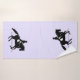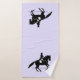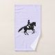 Towel set with a black and white illustration of a dressage rider. The horse and rider are performing a pirouette. Classy and beautiful. Set on a watercolor background in delicate and muted pastel colours Light purple background.