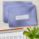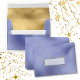 Elegant special occasion envelope done in graphics of a dusty light blue foil look, on the outside, and a gold foil, on the inside of the envelope. Gold edged white text areas for addresses, with fully custom black text, on the backside.