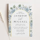 Elegant floral wedding invitations featuring your wedding details with a gold foil arched frame of dusty blue and white roses, hydrangeas, and lush eucalyptus leaves and greenery. This dusty blue floral wedding invitation is perfect for your spring or summer wedding!