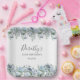Very pretty paper plate for a birthday party. The two floral borders feature dusty blue peony and rose flowers nestled in blue eucalyptus leaves. The woman's name is written in an elegant script font. Two lines of text let you customise your birthday message.