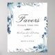 Elegant watercolor flowers and foliage in trendy shades of dusty blue, personalized wedding "Favors" sign poster. Modern typography design style mixes script with bold type.