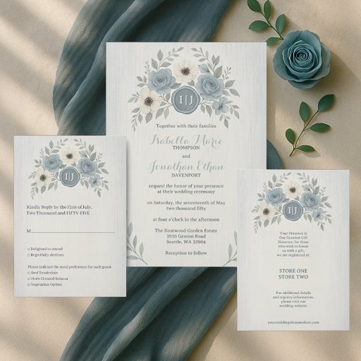 This elegant wedding invitation features soft dusty blue and ivory florals surrounding a wax seal monogram design on a textured linen background. Perfect for romantic garden weddings, rustic chic ceremonies, or timeless estate celebrations. The subtle gray-blue palette and botanical accents create a calm, sophisticated aesthetic.