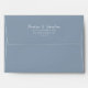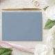 A minimalist boho light blue wedding envelope with return address. Which features simple dusty blue solid colour . With with white handwritten calligraphy of the bride's and groom first names along with the personalised return address label . And customisable return address info..