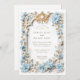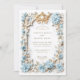 Announce your special day with this luxurious wedding invitation featuring exquisite dusty blue hydrangeas and delicate white blooms intertwined with gold baroque-inspired detailing. The ornate faux embossed frame adds a touch of sophistication, while the creamy white background creates a timeless and elegant look. Perfect for weddings with a vintage, romantic, or regal theme. Please note, the gold accents and embossed effects are printed and do not include real metallic foil or raised textures.