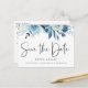 Elegant watercolor dusty blue and navy floral arrangements, wedding save the date postcard. Card features elegant calligraphy "Save the Date", on front and back.