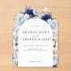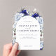 These stunning acrylic invitations are perfect for couples seeking a modern and romantic wedding. The design features a beautiful watercolor floral arrangement in shades of dusty blue and navy, framing the invitation in a unique arch shape. The clear acrylic material adds a touch of elegance and allows the floral design to shine.