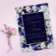 This exquisite invitation features a captivating navy and white roses arrangement, meticulously crafted with intricate gold foil details. Each element is thoughtfully designed to create a sophisticated and romantic ambiance for your special day.