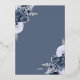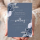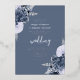 This elegant wedding invitation features dusty blue floral bouquets set off with silver faux foil greenery in two corners, on a dusty blue background. The customisable text combines real silver foil serif, italic and handwriting fonts. The reverse side features a matching dusty blue and silver floral design.