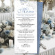 This beautiful menu will add some style to your wedding reception. It features a beautiful design with ornate silver grey faux foil curls and swirls on a classic white background, with dusty blue text and a marbled dusty blue back. There is space for the names of the couple and wedding date, and the text is fully customisable. Elegant, classy, and glam, this menu will add an air of sophistication and grace to your celebration.