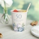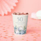 Elegant dusty blue and white floral women's 50th birthday party paper cups. Personalised with the name of the guest of honour, her age, and her party date. Contact me for assistance with your customisations or to request additional matching or coordinating Zazzle products for your party.