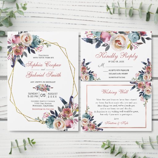 Modern, elegant, dusty peach pink and dusty blue rose floral wreath or arrangement with feathers watercolor floral wedding design on white background. Feature an elegant handwritten typography design with Bride and Groom name. At the back of the card rose floral wreath and the couple’s monogram. Great choise for romantic floral weddings. #3343 If you need help or matching items, please contact me.
