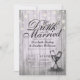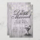EAT Drink and Be Married Wedding Celebration Invitation Cards Templates - Elegant Lettering Script, Vintage Champagne Glasses and String Lights on Rustic Wood Background.
