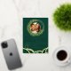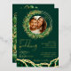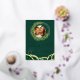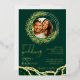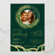 Create unique wedding invitations with an emerald green and gold design with custom photo and text. These invites are decorated with elegant emerald eucalyptus wreath and foliage and an agate style pattern. Templates make it easy to personalise and customise. Please use the template to upload the photo to get it in a round shape. The square picture works the best.