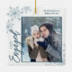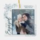 This square Christmas ornament is a perfect gift for the newly engage couple. The design features a photo frame with handwritten text "Engaged" and is accented with light blue snowflakes. Personalise with a pictures of the couple, their names and year.