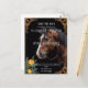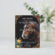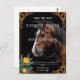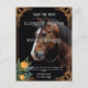 This wedding invitation design features a striking horse gracefully poised against a warm beige background. Ornate floral and scrollwork patterns frame the image, adding a touch of sophistication and charm. The intricate border details in black and gold tones evoke timeless elegance, making it a perfect representation of love, strength, and beauty for a memorable wedding celebration.