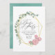 Trendy geometric eucalyptus greenery and blush pink roses garden party invitation with gold geometric frame and mint watercolor wash reverse. Celebrate your special occasion with this elegant garden party invitation featuring a geometric gold frame adorned with watercolor eucalyptus leaves and delicate pink roses. Perfect for birthdays, bridal showers, or any outdoor celebration. Customisable text allows you to personalise every detail for your unique event.