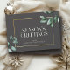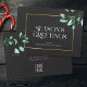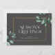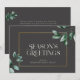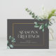 Stylish, elegant business holiday greetings card reading SEASON'S GREETING alongside modern eucalyptus watercolor illustrations within a printed gold frame design, your custom message on the back alongside your corporate logo.
