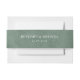 Elegant Eucalyptus green wedding invitation belly band personalised with the bride and groom's names and the wedding date in a classic serif font.