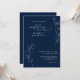 This wedding invitation features a rich navy blue background with clean white script typography. Delicate eucalyptus greenery appears in thin line art, adding a soft botanical touch. The layout is formal and elegant, with modern spacing and a refined style. This design is ideal for couples who want a classic navy blue theme with fresh greenery accents. It creates a calm, polished, and timeless look for any formal or modern wedding.