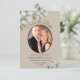 This beautiful save the date card will let your friends and family know about your upcoming wedding. It features an elegant boho chic design with your photo in an oval frame surrounded by eucalyptus leaves and greenery on a tan or light brown background. There is space for your names, the wedding date and location. The back features a rustic country bouquet of foliage tied with a white ribbon and bow.
