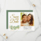 Elegant eucalyptus Save the Date card with custom photo, names and date. The back side is sage green, but you can change it to white or another colour before ordering.